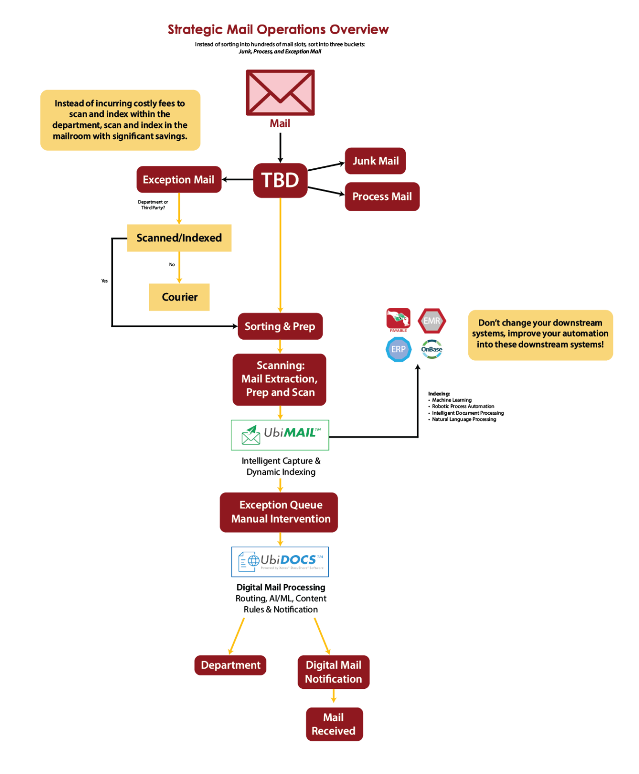 Our digital mail approach delivers hard savings by consolidating mailrooms, reducing courier and USPS fees, minimizing manual labor, and unlocking bulk mailing discounts. It increases operational efficiency, supports remote and hybrid staff with digitized mail delivery, eliminates junk mail, and improves accounts receivable processes. By integrating securely with your business systems, you gain enhanced security and audit capabilities. This solution drastically reduces mailroom space needs, staff requirements, and costs, while ensuring faster, more accountable mail handling across your entire enterprise.
